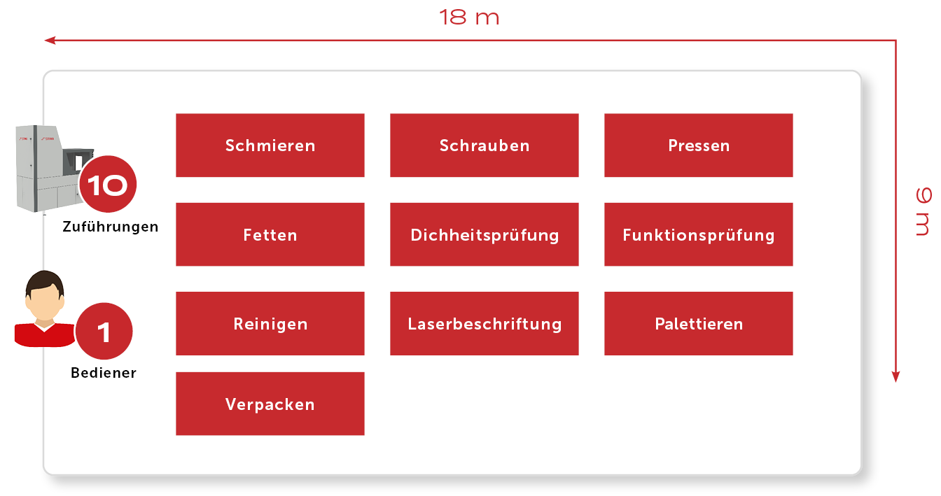In Rüstbahnhöfen wird der Werkzeugwechsel automatisch durchgeführt. Somit können 70 Produkttypen in verschiedenen Baugrößen verarbeitet werden.