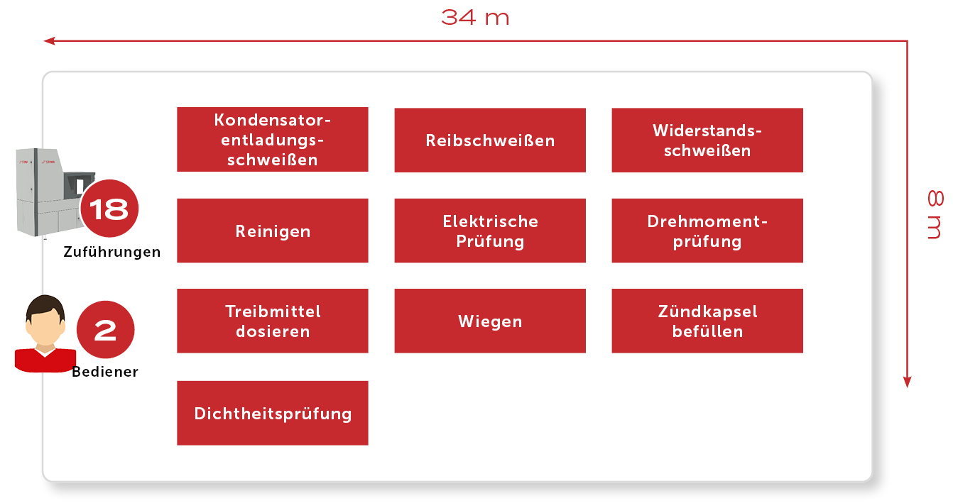 Die Einzelteile werden als Schüttgut zugeführt, vereinzelt und in Schweiß- und Fügeprozessen bearbeitet. Die Treibladungen werden in Eimern in die Explosionsschutz-Vorrichtungen eingesetzt und in die Schutzumhausungen entleert, dosiert und in die Baugruppen gefüllt. Anschließend werden Funktionsprüfungen durchgeführt und die Baugruppen mit Etiketten beschriftet. Die fertigen Produktteile werden voll- oder teilautomatisch in Einweg- oder Mehrwegverpackungen für den Transport vorbereitet.