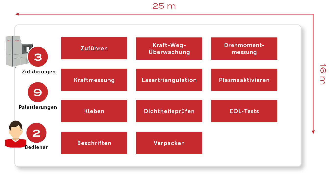 In diesem vollautomatischen Anlagenverbund von STIWA werden verschiedene Typen von Spannungswandlern montiert und geprüft. Diese werden in Autos eingebaut, etwa für Start-Stopp-Systeme, wo sie dabei helfen, Kraftstoff zu sparen, z.B. durch elektrische Lenkunterstützung.