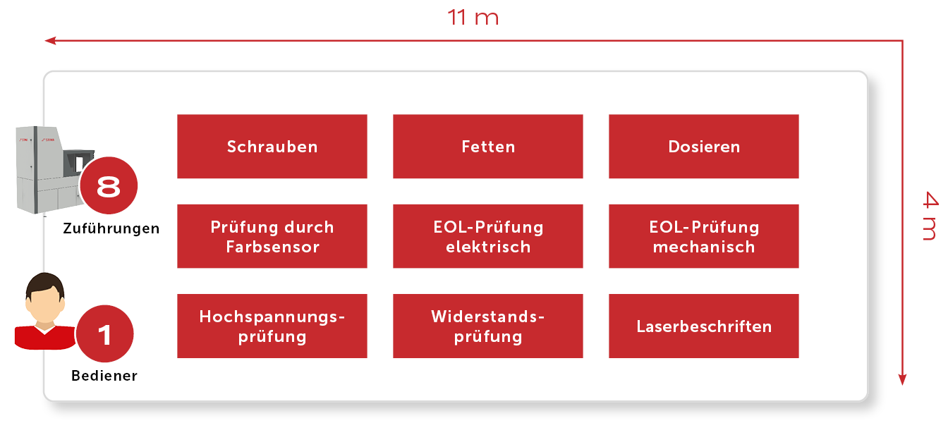 Viele Zuführungen bei möglichst kurzer Anlagenlänge und dabei gleichzeitig optimale Auslegung der Modulzugänglichkeit. STIWA-Schrauber arbeiten auf engem Bauraum.