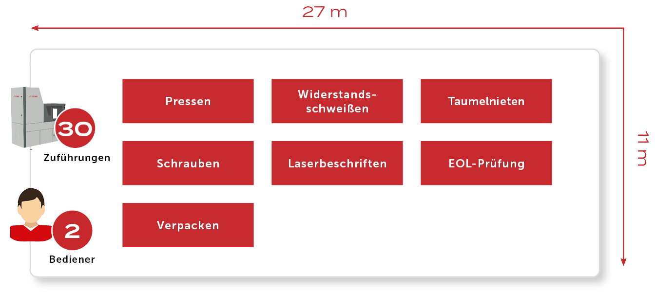 Simultane 3-fach-Vernietung in 4 Prozess-Stationen ermöglicht eine kurze Taktzeit. Daraus resultiert ein geringerer Platzbedarf und niedrigere Kosten im Vergleich zu 12 einzelnen Taumelnieteinheiten.