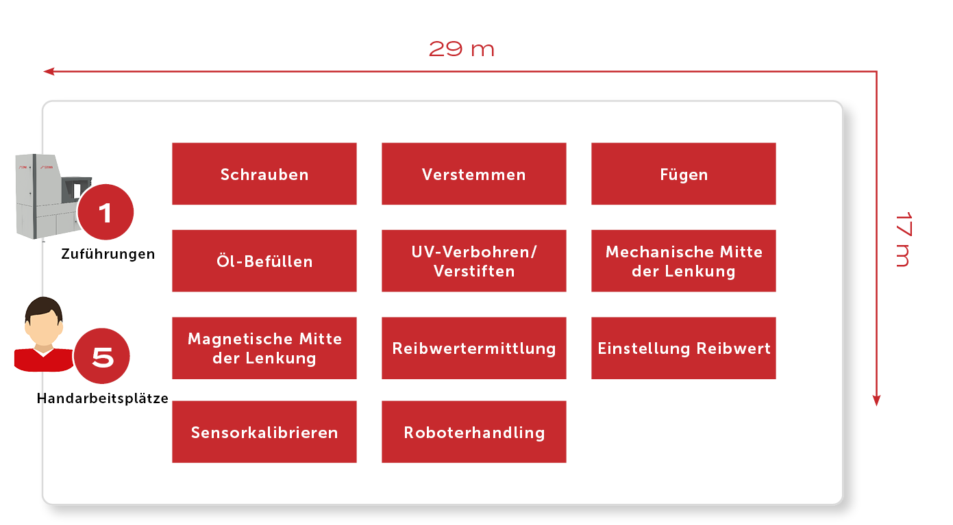 Innovative Kernprozesse wie das Verbohren und Verstiften der Spindel mit der Eingangswelle oder das Einkugeln der Spindel in das Lager sind wesentlicher Bestandteil dieser Anlage. Die Dichtheitsprüfung und das Befüllen der Lenkung mit gefiltertem, entgastem Hydrauliköl erfolgen im automatisierten Ablauf.