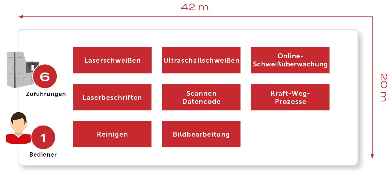 Unterschiedlichste Abläufe sind auf einer Grundfläche von 42 x 20 Meter miteinander kombiniert. Das Herzstück der Anlage sind modernste Laser- und Ultraschallschweiß-Stationen, ebenso Bestandteil des Verbundes sind Kraft-Weg-Fügeprozesse.