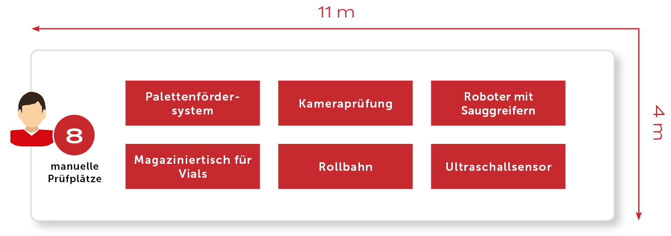 Die Fläschchen werden in Trays auf Paletten bereitgestellt, von einem Roboter mit Sauggreifern entnommen und an einen Speichertisch übergeben, von dem sie automatisch in eine Förderanlage geschleust werden. Nach der Inspektion werden die Fläschchen wieder vom Transportband entnommen und in die Trays zurückgeschlichtet. Bei negativen Prüfergebnissen werden sie automatisch zu Handarbeitsplätzen gebracht und dort einzeln überprüft.