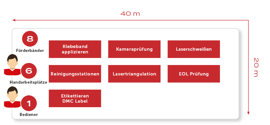 Auf einer Fläche von 800 m² werden – direkt aneinander angrenzend – in der ersten Anlage der untere Teil des Zellkontaktiersystems auf Rundzellen geschweißt und in der zweiten Anlage der obere Teil verschweißt. Die beiden unabhängig voneinander gefertigten Bauteile werden im Anschluss zusammengesetzt und in weiterer Folge in Fahrzeuge verbaut. Die Beschickung der zu verbauenden Komponenten erfolgt händisch mittels Hebehilfe und Förderbändern.
