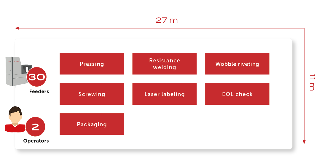The miniature circuit breaker consists of 33 individual parts, which are supplied and assembled step by step. This assembly line handles a wide range of product variants. Finished parts are placed on an output belt or conveyor belt at the end of the assembly process. The system is connected to an intralogistics system.