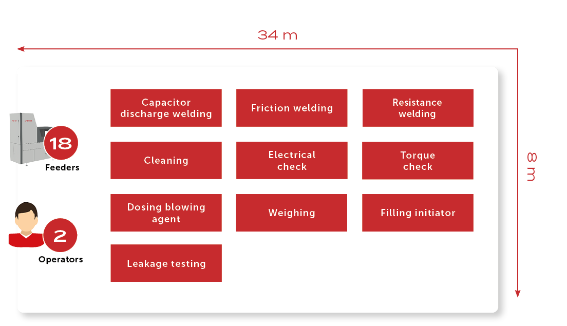 The individual parts are fed as bulk material, isolated and processed in welding and joining processes. The propellants are placed in buckets in the explosion protection devices and emptied into the protective enclosures, dosed and filled into the assembly. Functional tests are then carried out and the assembled parts are labeled. The finished products are prepared fully or partially automatically in disposable or reusable packaging for transport.