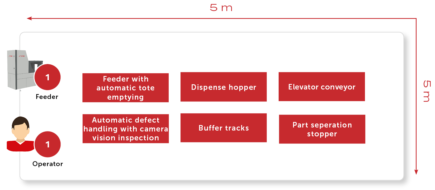 A continuous camera vision inspection of the parts is carried out in a continuous process, whereby products with deviations or foreign objects are immediately sorted out. This is crucial to ensure that no incorrect types enter the down stream processes.