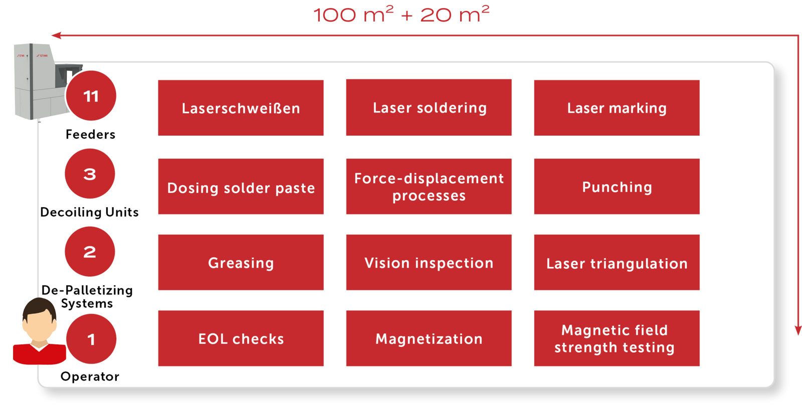 In this dual line machine system from STIWA, electrical assemblies for toothbrushes are produced and tested. The individual components are fed in via 11 feeders, 3 decoiling units, and 2 de-palletizing systems.