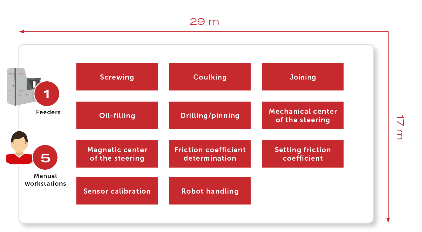 Innovative core processes such as drilling and pinning of the spindle with the input shaft or the ball insertion of the spindle into the bearing are essential parts of this machine. The leak test and filling of the steering with filtered, degassed hydraulic oil are carried out in an automated process.