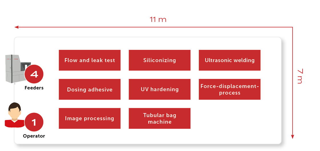 In this fully automated STIWA machine, tube holders for blood sampling are assembled, checked and packaged. The tube holders act as adapters between the canula and the sample tube, making handling easier for medical personnel and minimizing the risk of injury from contaminated needle tips.